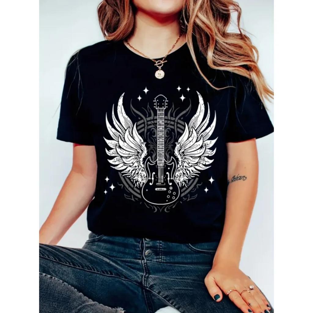 Women's T-shirt Guitar Wings Print Harajuku Gothic Sports T-shirt Round Neck Short Sleeve Sweatshirt Women's Sportswear Tops