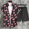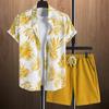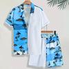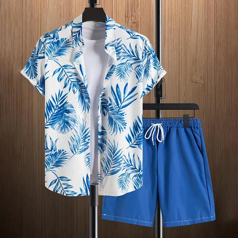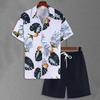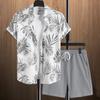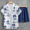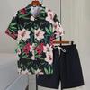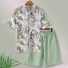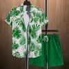 Stylish Lapel Button-Down Shirt Shorts Set Summer Men's Short-Sleeved Shirt Drawstring Shorts 2-Piece 3D Leaf Print Travel Suit