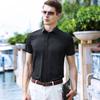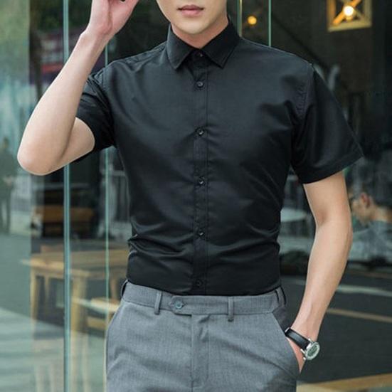 Attention to detail is evident in the finely crafted cuffs and collar, complemented by evenly stitched seams. The short sleeves provide comfort and style, ideal for spring and summer wear. Featuring a classic turndown collar and simple button design, this shirt balances smartness with casual appeal. Available in versatile solid colors, it pairs effortlessly with gray trousers, jeans, or other bottoms for business or leisure occasions.