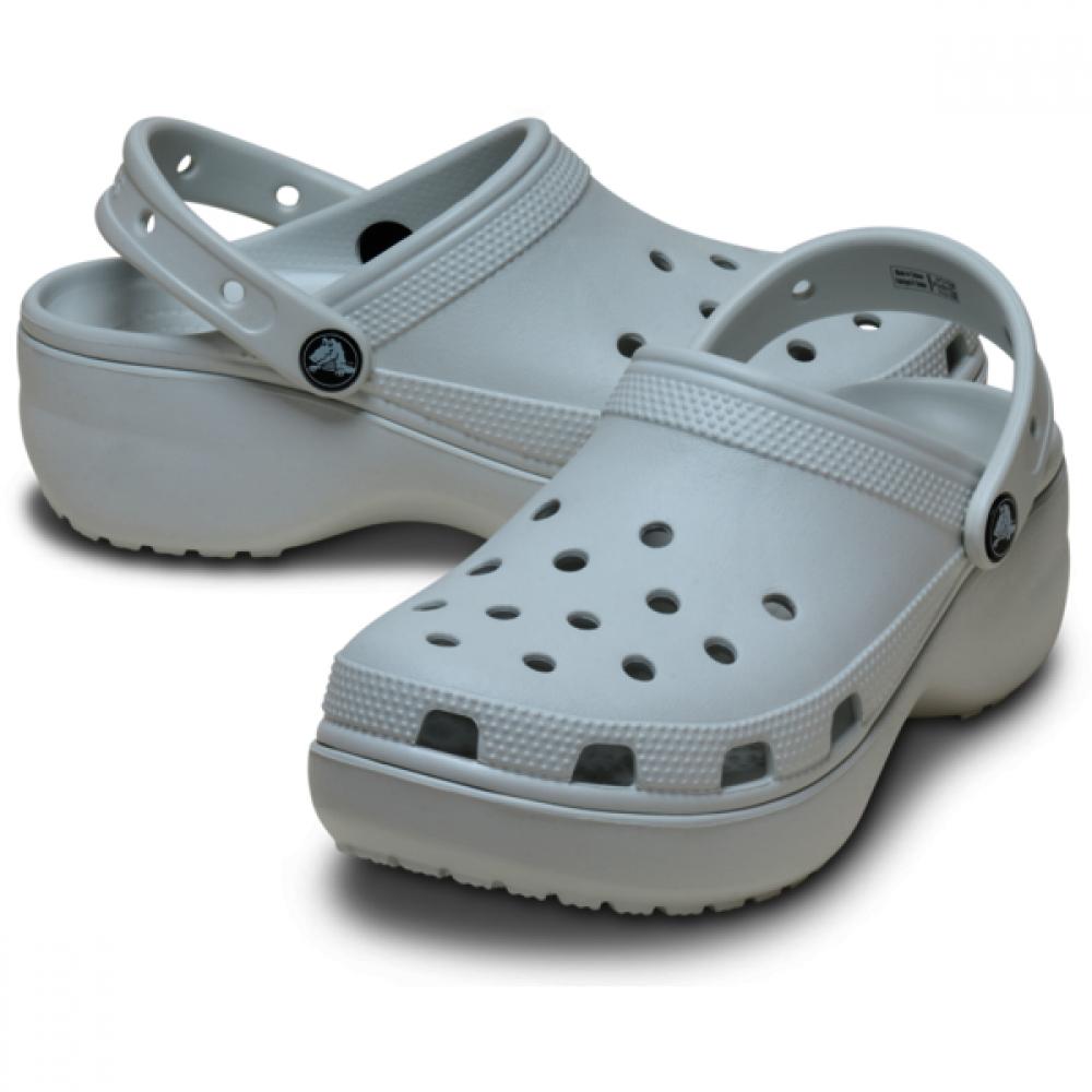 The Crocs Classic Platform Clog 206750-1NK Moonlight features a classic clog design enhanced with a high platform outsole. The heel height is approximately 4.1 cm, providing stability and comfort. The customizable back strap and Jibbitz charms add personal flair, while the Dual Crocs Comfort technology offers support and softness.