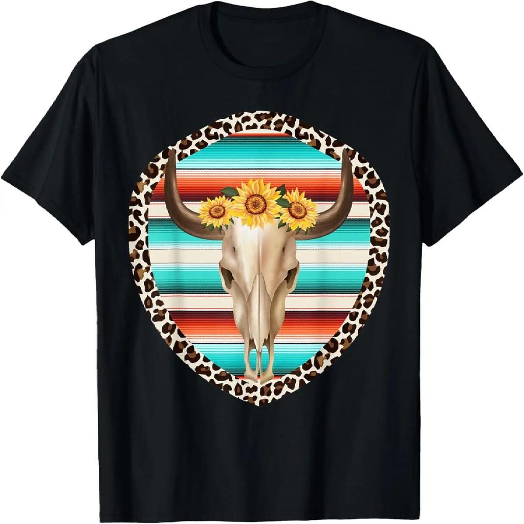 Funny Serape Cow Skull print Sunflower Leopard Turquoise T-Shirt