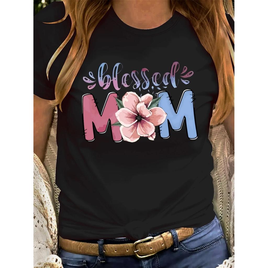 Women's Blessed Mom Graphic Tee Short Sleeve Round Neck Casual Sporty Style Perfect for Spring Summer Multiple Colors