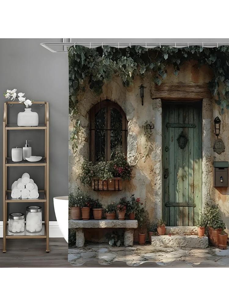 Italian Street Scenery Potted Plant Shower Curtain, Bathroom Decorative Shower Curtain, Waterproof Shower Curtain with Hooks