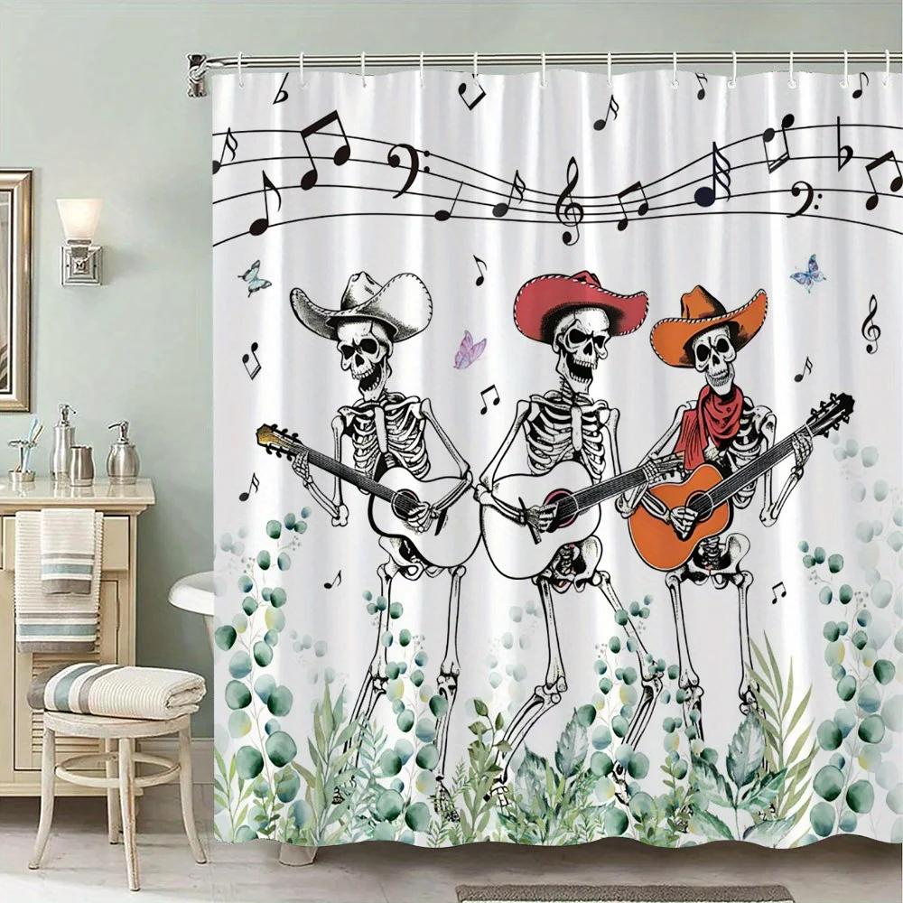 Guitar Playing Skeletons Shower Curtain - Colorful Hats & Dancing Skeletons, 12 Hooks, Fun Festive Bath Decor
