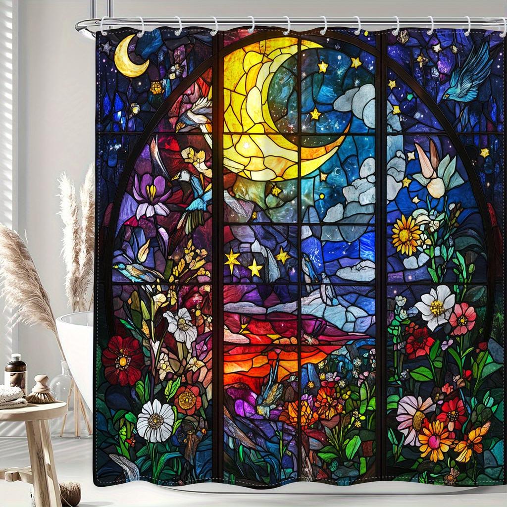 Stained Glass Moon & Flowers Waterproof Shower Curtain - Enchanting Design for a Dreamy Bathroom Décor Experience