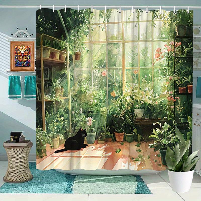 Polyester Shower Curtain - Black Cat & Greenery, Sunlit Greenhouse Scene, 12 Hooks, Machine Washable, Stylish Bathroom Decor