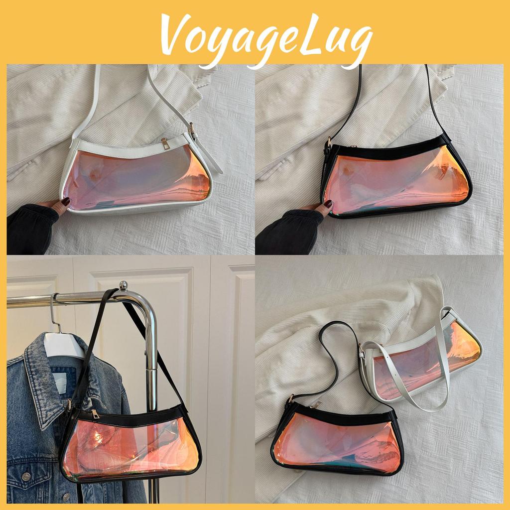 This stylish small shoulder bag features a transparent PVC construction with a laser element, enhancing its modern streetwear appeal. Measuring approximately 28.5cm in width and 13.5cm in height, it offers a compact yet functional design suitable for daily use. The bag employs a secure zipper closure and includes an interior polyester lining with an inner slip pocket for organization, providing reliable storage for essentials.