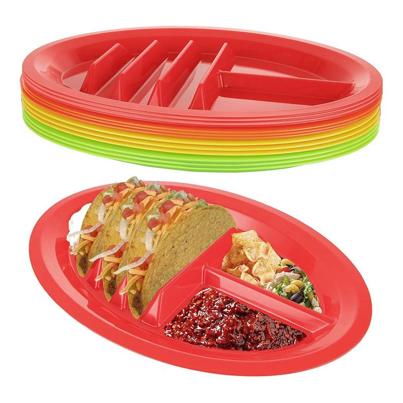 PGY 4/8 Packs Plastic Taco Plates for Party Large Taco Holder with 2 Dipping Areas Stand Up Divider for 3 Tacos Dishwasher Safe