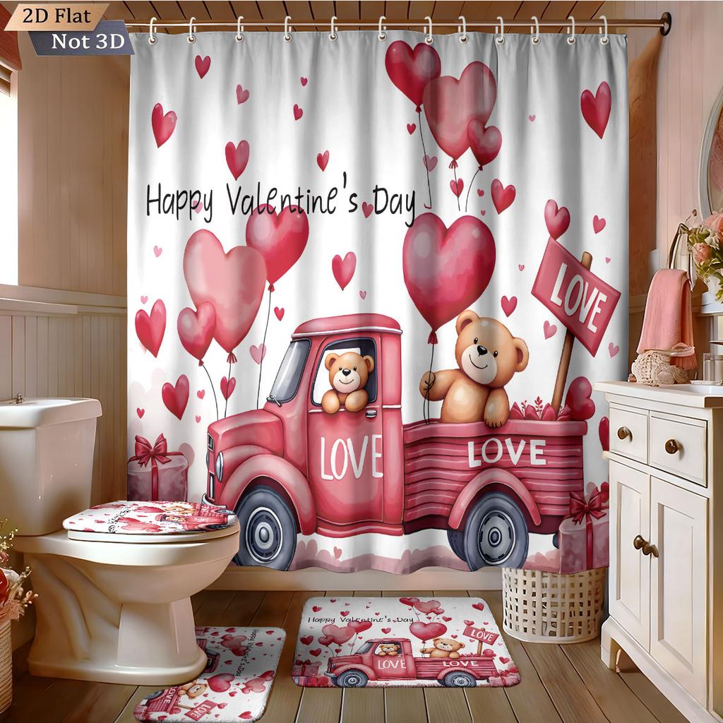 4pcs Valentine's Day Romantic Rose Flower Printed Bathroom Set Waterproof Shower Curtain Floor Mat Toilet Mat U-Shaped Mat