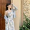 Women's Blue Floral Strappy Dress - French Tea Party, Waist-Cinched, Long Summer Beach Dress