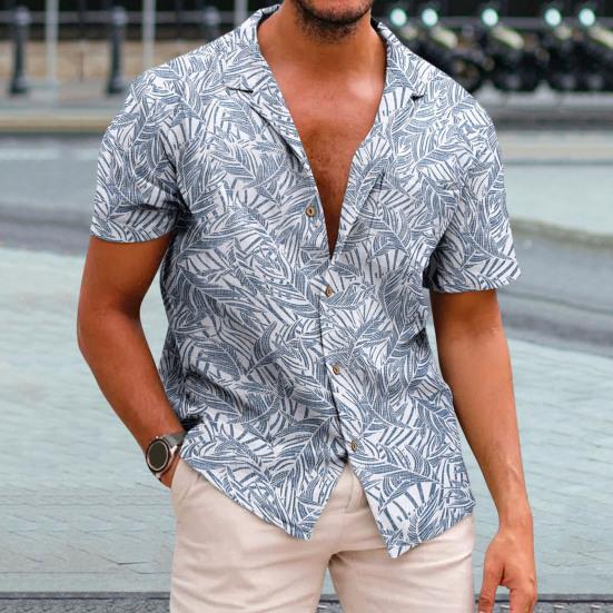 Caracteristici: Cămașa pentru bărbați are imprimeu cu frunze, guler cu rever, mâneci scurte și nasturi la un singur piept pentru un stil casual, fără efort.