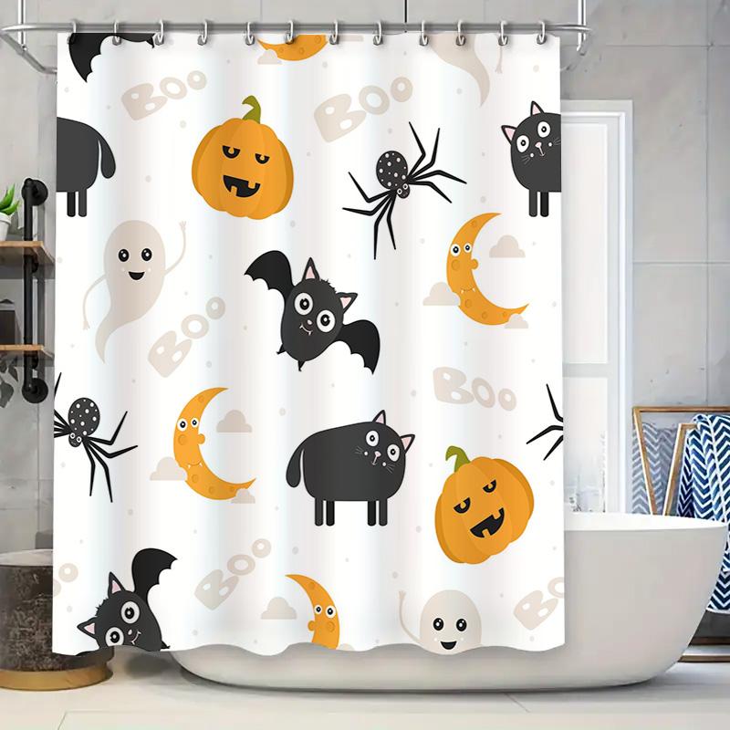 Halloween-themed shower curtain with cute patterns for bathroom decoration white background, pumpkin ghost cat bat moon design