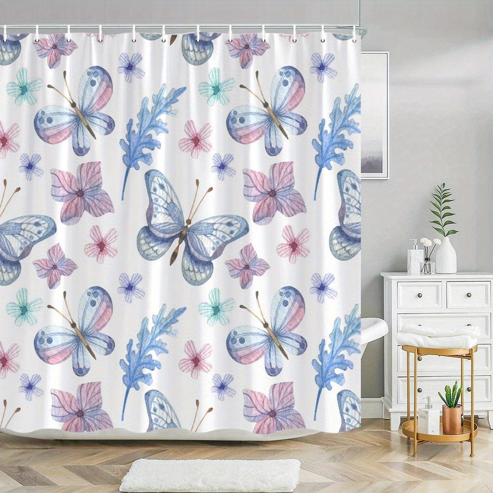 1pc Blue Pink Butterfly & Floral Watercolor Shower Curtain - Soft Pastel Design, Elegant Bathroom Decor for Bathtub
