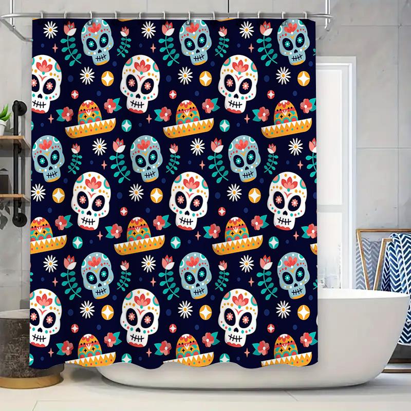 Multicolored Skull Print Shower Curtain for Bathroom Decor Blue Floral Design Polyester Fabric Water Repellent Waterproof Home C