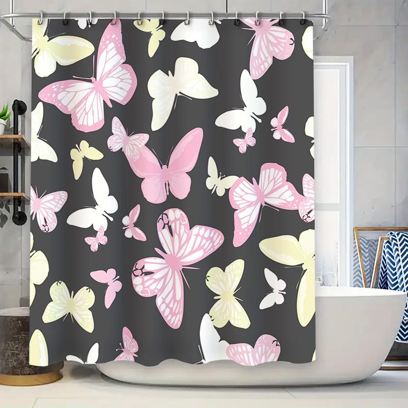 Colorful Butterfly Shower Curtain SetPink White Floral Pattern for Bathroom Decor Modern Home Decorative Shower Curtains with Ro
