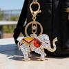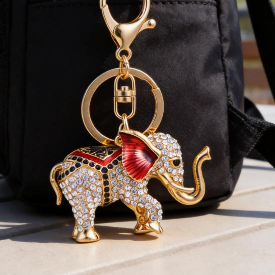 This exquisite elephant keychain features a durable alloy electroplating process, ensuring long-lasting color that resists fading. Adorned with firmly inlaid, colorful rhinestones and accented by vibrant red ears and contrasting saddle decorations, it dazzles brilliantly under light. The three-dimensional elephant design symbolizes peace, good luck, wealth, and good fortune, enhanced by exotic decorative patterns for a unique and meaningful accessory.