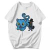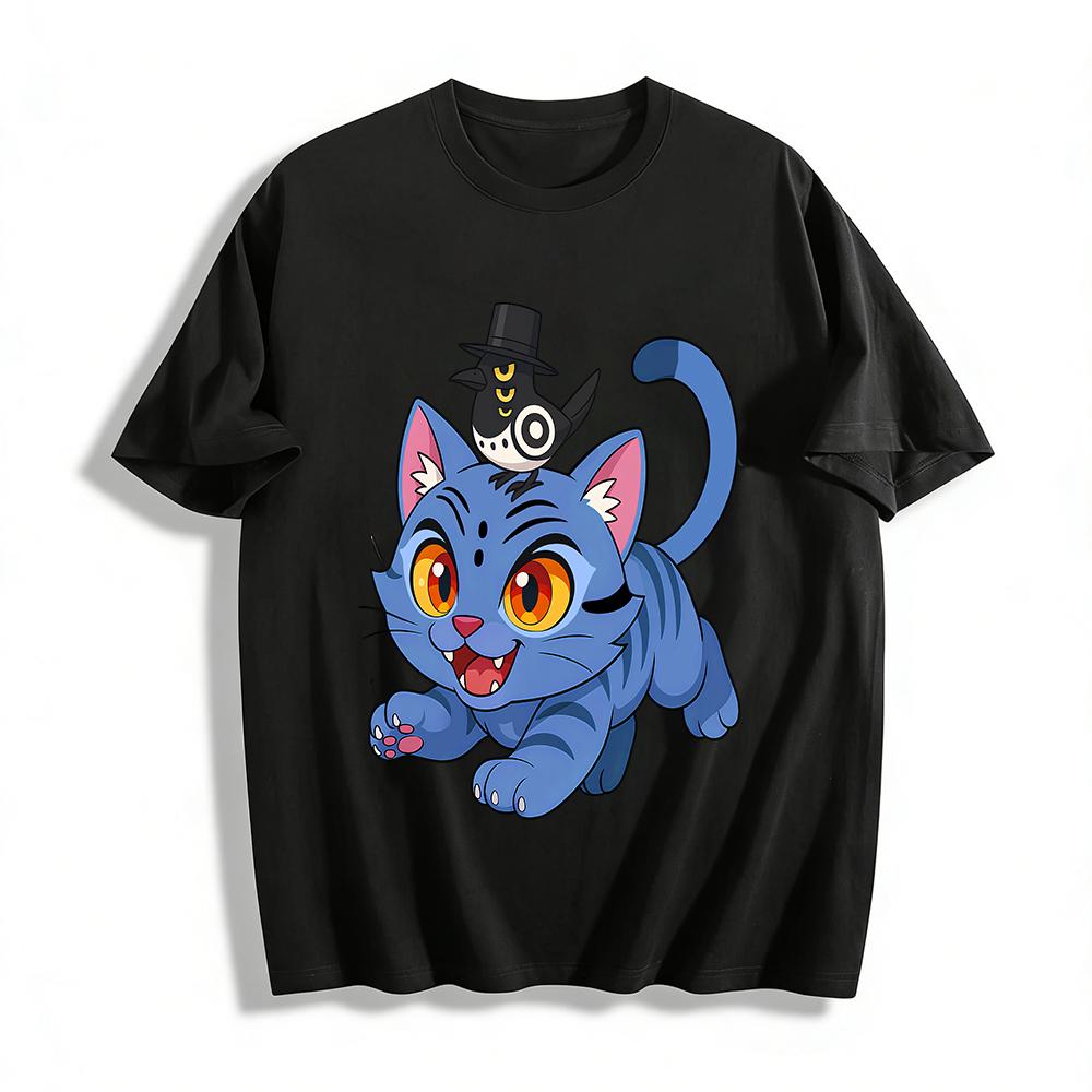 Cartoon Blue Cat & Magpie Print T-Shirt Unisex Casual Loose Breathable Daily Wear Top Pure cotton T-shirt