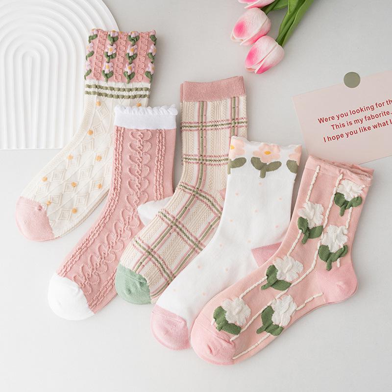Autumn 3D Flower Plaid Mid-Calf Socks - Pink & Versatile Fashion