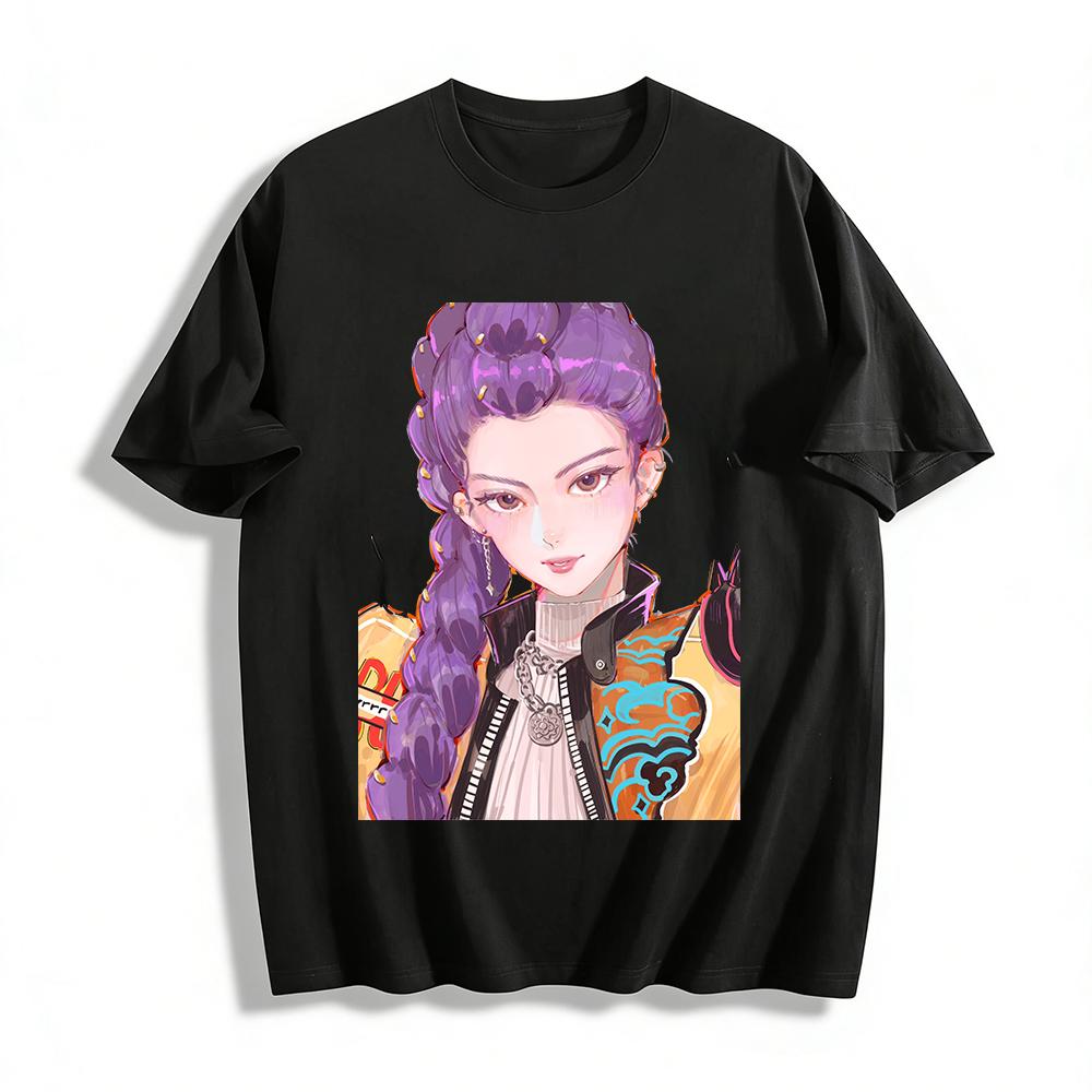 Cool Street Style Top With Chinese Style Purple Braid Girl Print Unisex Casual Loose Coat Pure cotton T-shirt