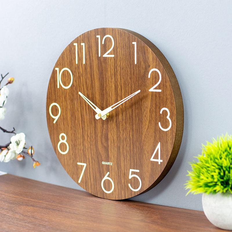 Luminous wooden wall clock, silent wood grain, creative and light luxury style, living room simple quartz clock, 30cm