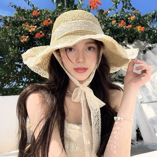 Women Beach Hat Large Eaves UV Blocking Foldable Portable Handmade Straw Hollow Sun Protection Hat with Lace Ties