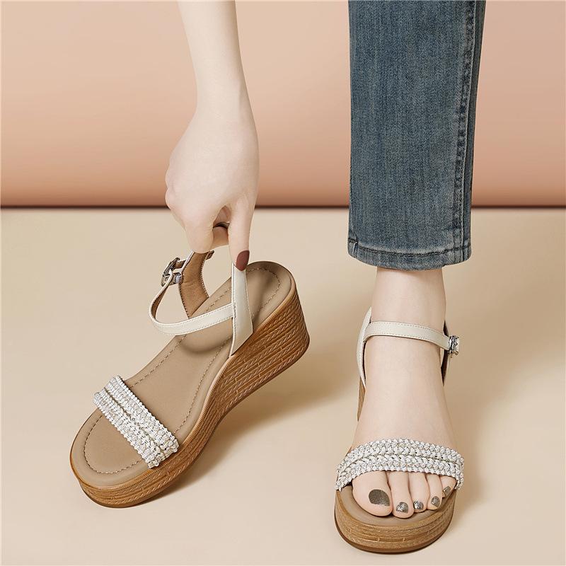 Dew finger square buckle beach shoes fashionable and durable simple high-end elegant sandals wedge heel small height increase single shoes