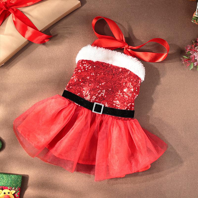 Bow & Belt Design Christmas Sequin Tutu Dog Dress, Red Velvet Halter Skirt, Holiday Pet Outfit for Small/Medium Dogs,