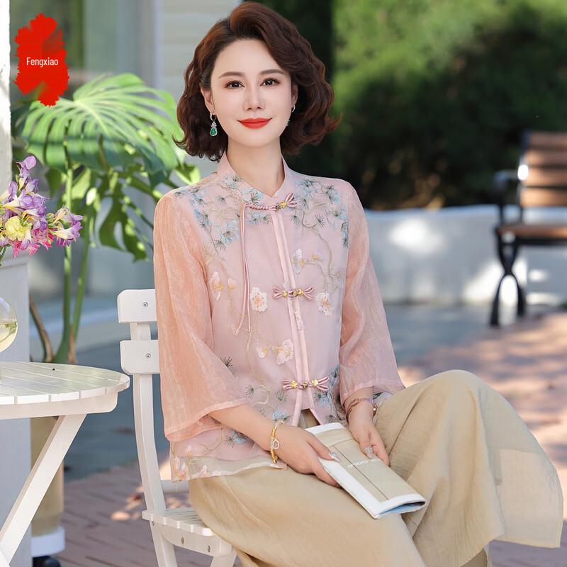 New Chinese Style Chiffon Top & Pants Set for Moms