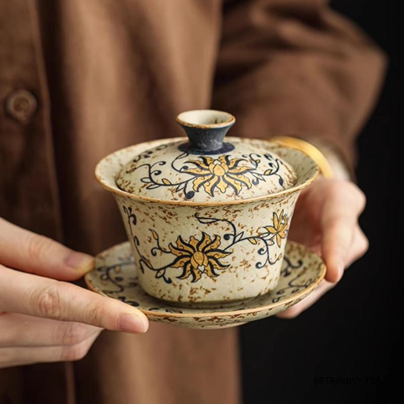 Chinese Retro Handmade Ceramic Gaiwan Hand-painted Flowers Pattern Teacup Household Travel Tea Bowl Portable Teaware Accessories