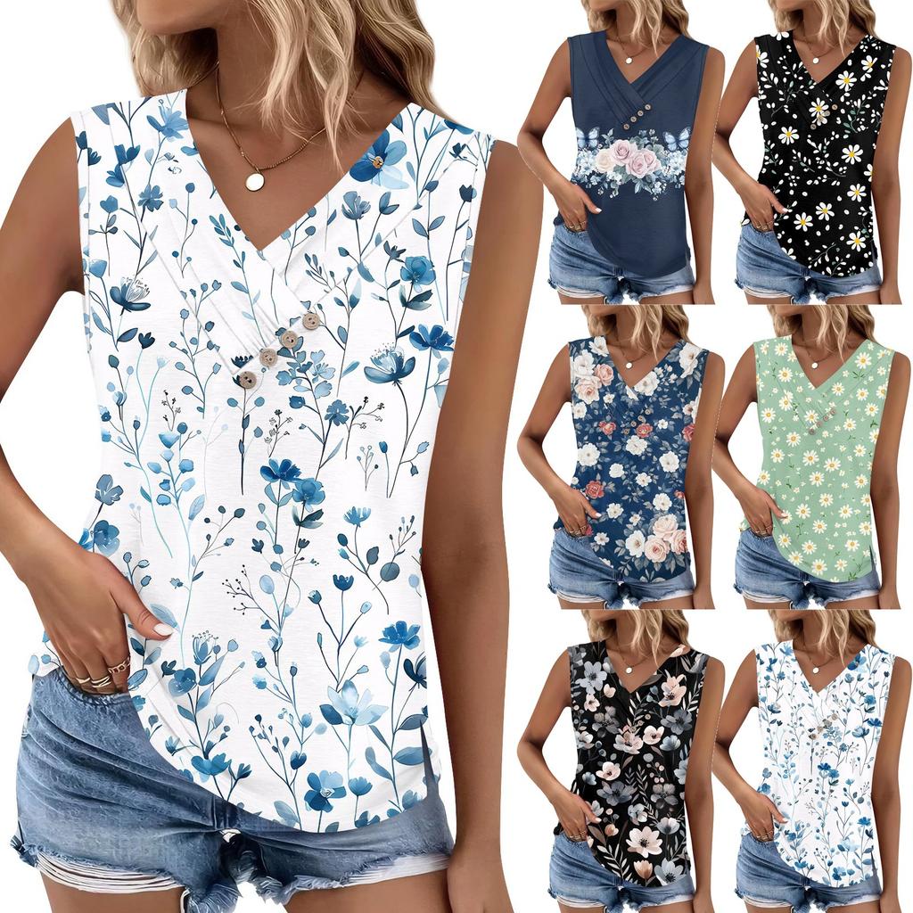 Maiou de damă cu imprimeu, cu nasturi, cu gât în V, fără mâneci, larg, top la modă