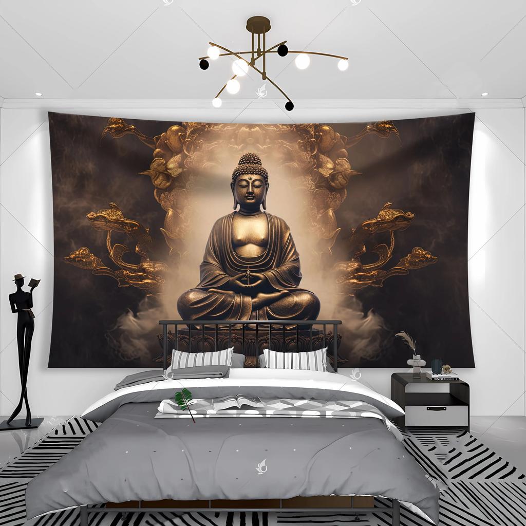 Zen Buddha Tapestry Serene Meditation Golden Clouds Unique Wall Art for Yoga Room Home Decor Spiritual Gift
