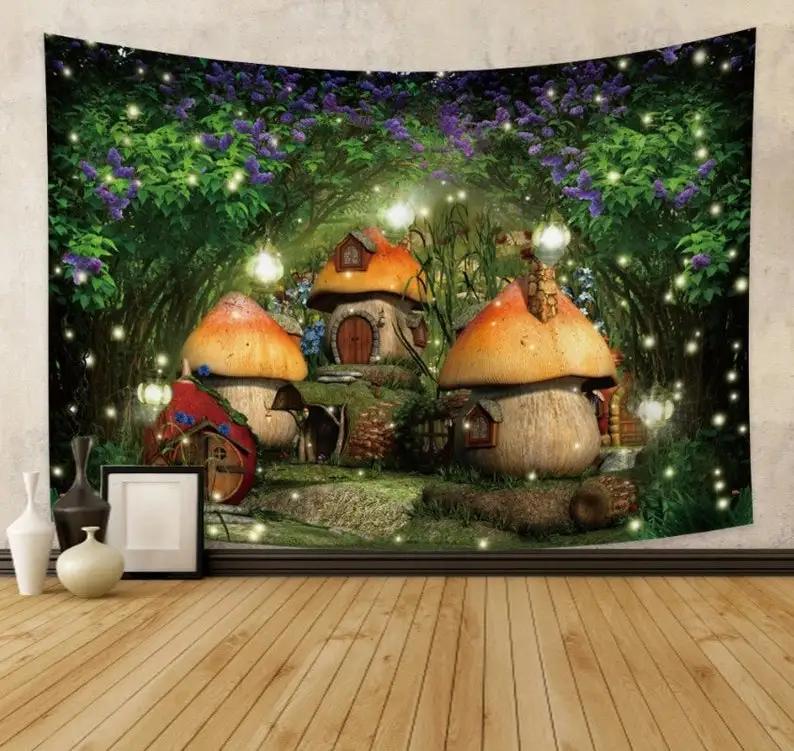 Magical Mushroom Village Tapestry Whimsical Fantasy Wall Art Large Enchanting Home Decor Tapestry