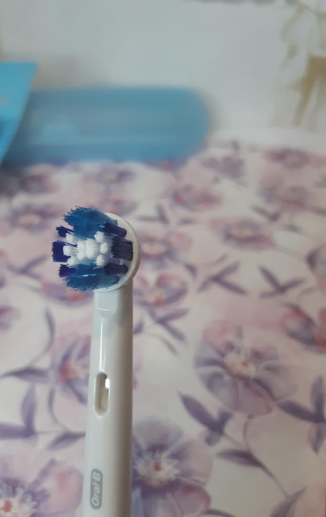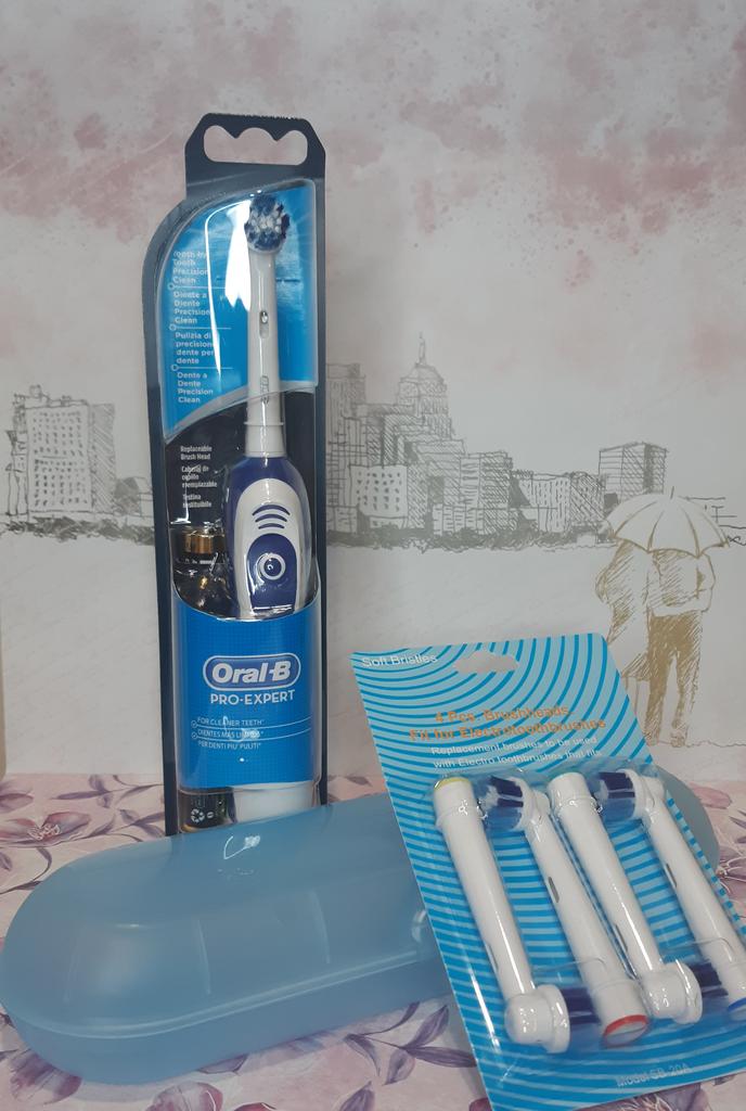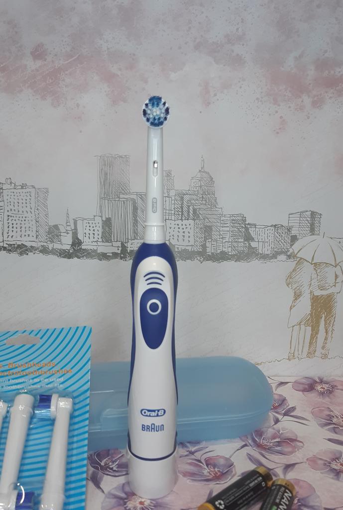Электрическая зубная щётка Oral B ✔Муж попросил насадки купить на нашу электрическую щётку. А я смотрю на цены и понимаю, что тут выгоднее впринципе купить ещё одну щётку. ✔В комплекте щетка, контейнер для неё и 4 сменные насадки с разноцветными колечками, чтобы не запутаться где чья насадка и 2 батарейки АА. ✔Доехала супер быстро: от склада продавца до меня за 6 дней. Донёс курьер до самой двери квартиры. ✔Размер щётки без насадки 17,5×4 см, с насадкой высота 21 см. ✔Чистит мягко и качественно. Продавцу спасибо⚘