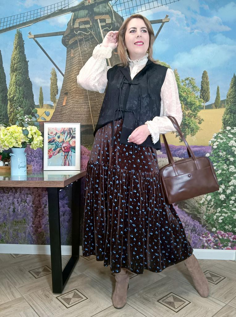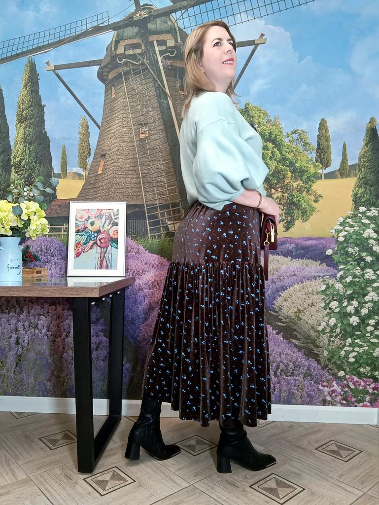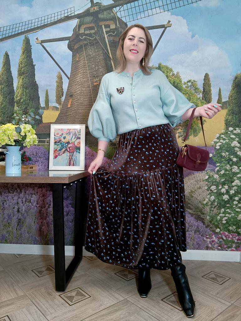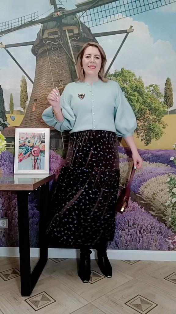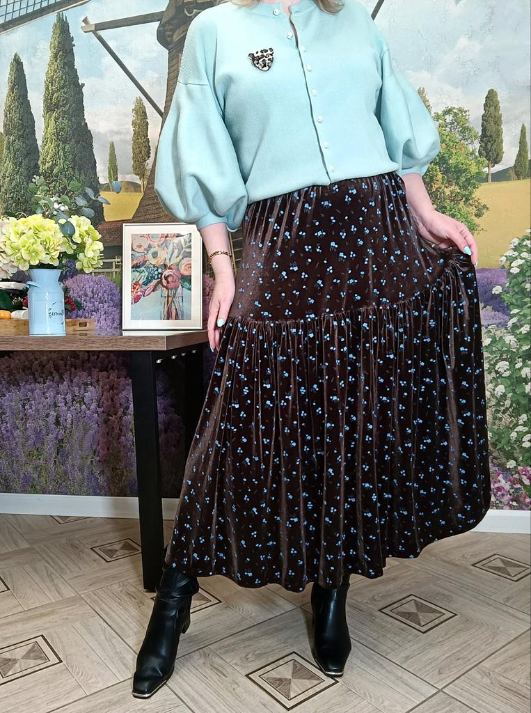 БАРХАТНАЯ ЮБКА⚜️ ШИКАРНАЯ 🩵🤎 Привет 👋 Девочки, сегодня покажу вам классную не дорогую бархатную юбку, которая выглядит как с обложки! Очень красивое сочетание расцветок Качественный нежный принт Ткань красиво переливается Пошив фабричный Юбка А-силуэта, каскадная. На талии широкая удобная резинка Ткани не пожалели, красиво фалдит в движении. Принт - голубые цветы - выполнен краской по ткани, ощущается под пальчиками. Ткань: полиэстер К телу приятная Тянется. Гладится легко, не мнется, не электризуется. Тяжёлая, пружинит при ходьбе. На выбор две расцветки: 🤎🖤 Размер единый Подойдёт от 44 до 54 точно! Мой рост 173см. Параметры: 98/89/110 Размер одежды 50 -52 Замеры в едином размере: 📏длина 90см 📏ОТ 60- 98см 📏ОБ 128- 135см Юбка просто в самое ❤️ И цвет, и фасон, и расцветка - тренд, писк и хит сезона. От души рекомендую ✅ И юбку, и магазин в целом 👍 обожаю! #elena_likui #Alyaboomty #юбка_бархатная